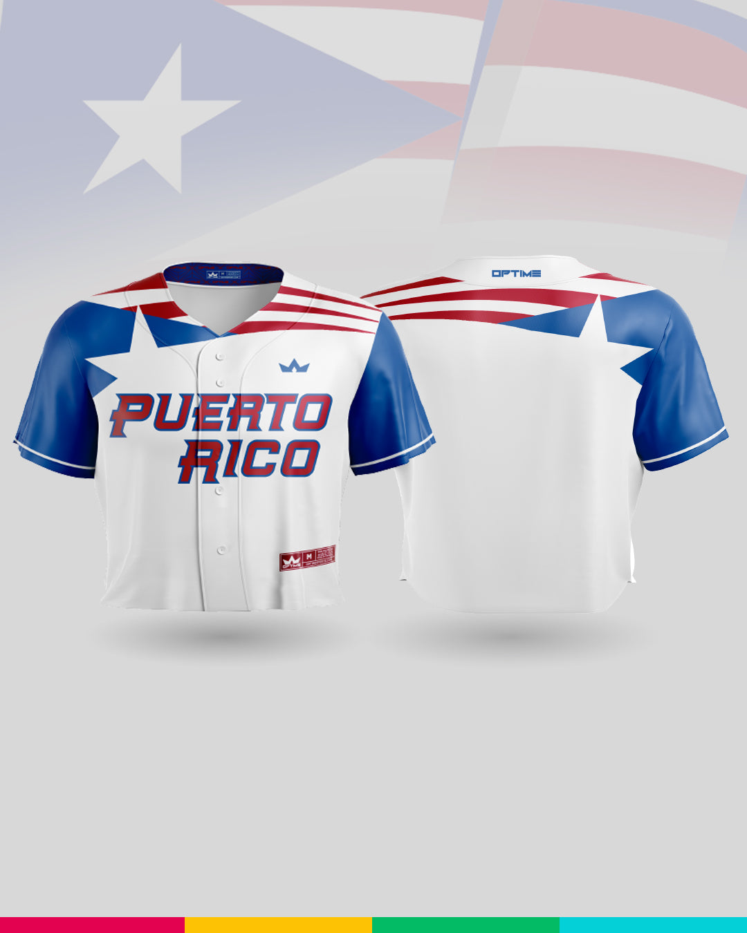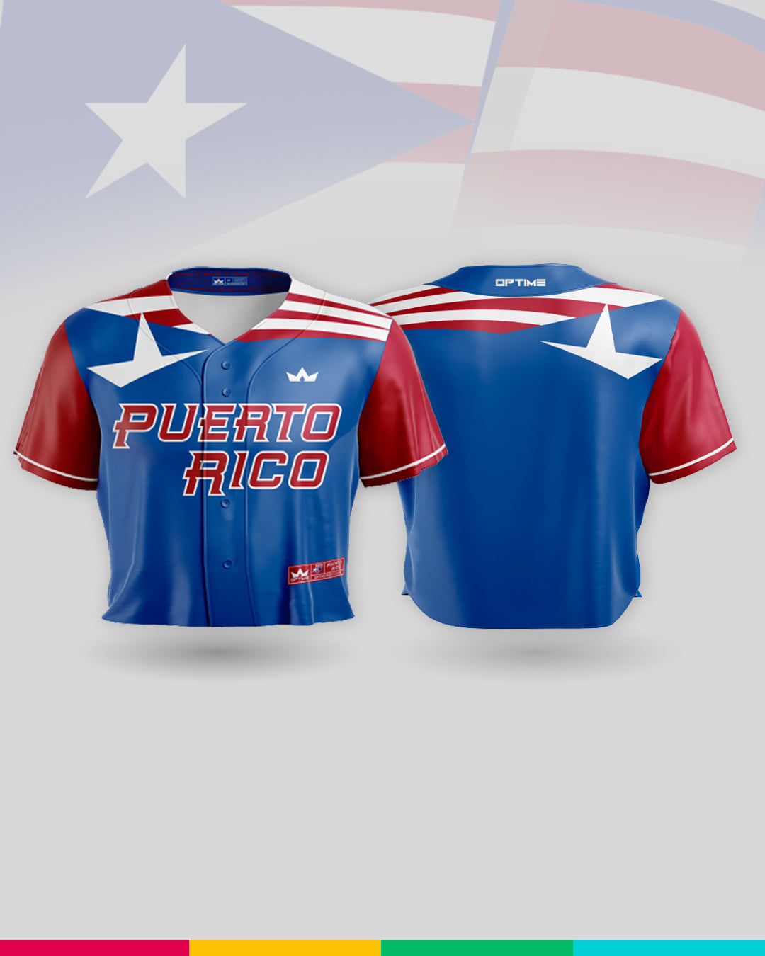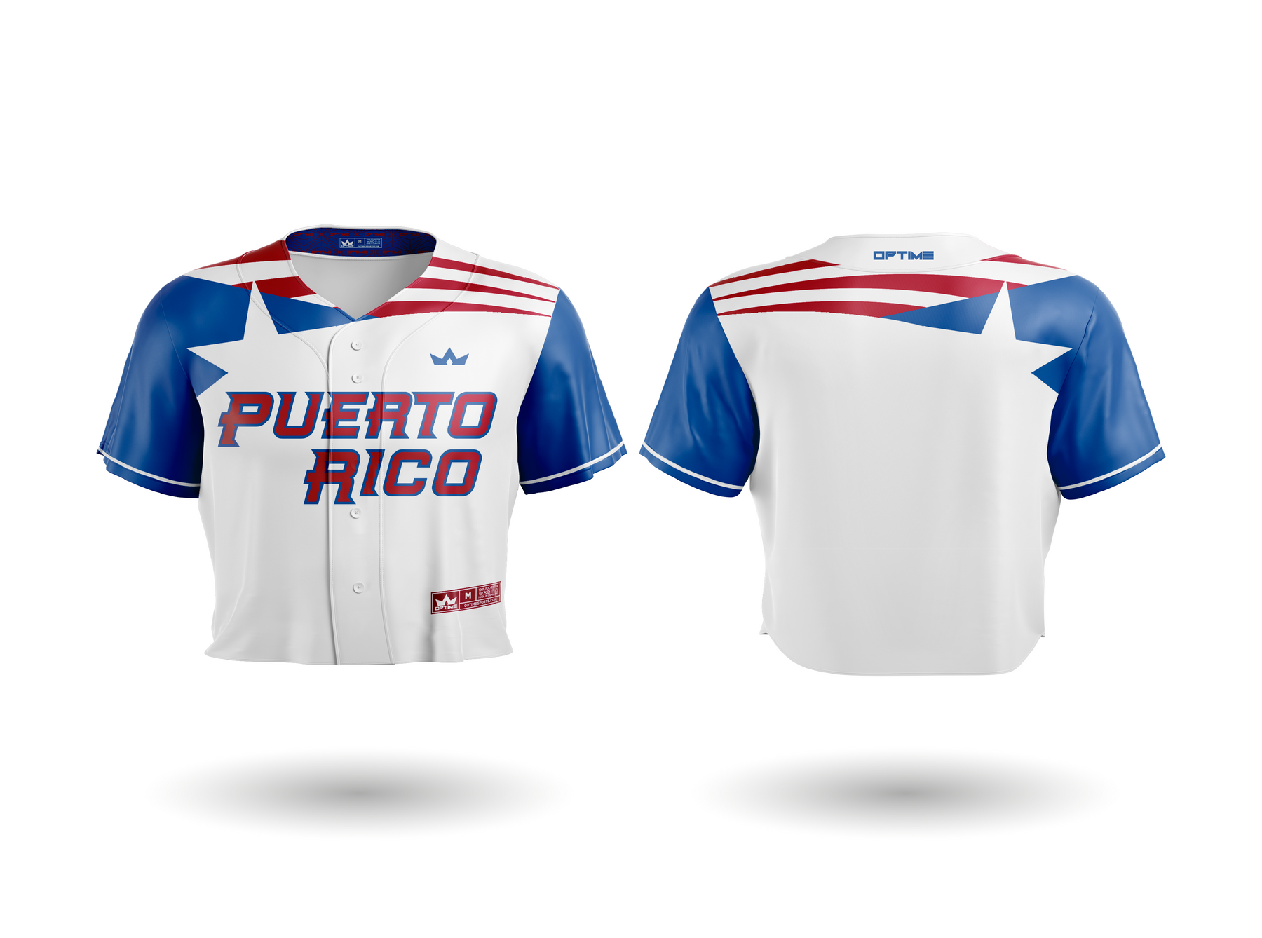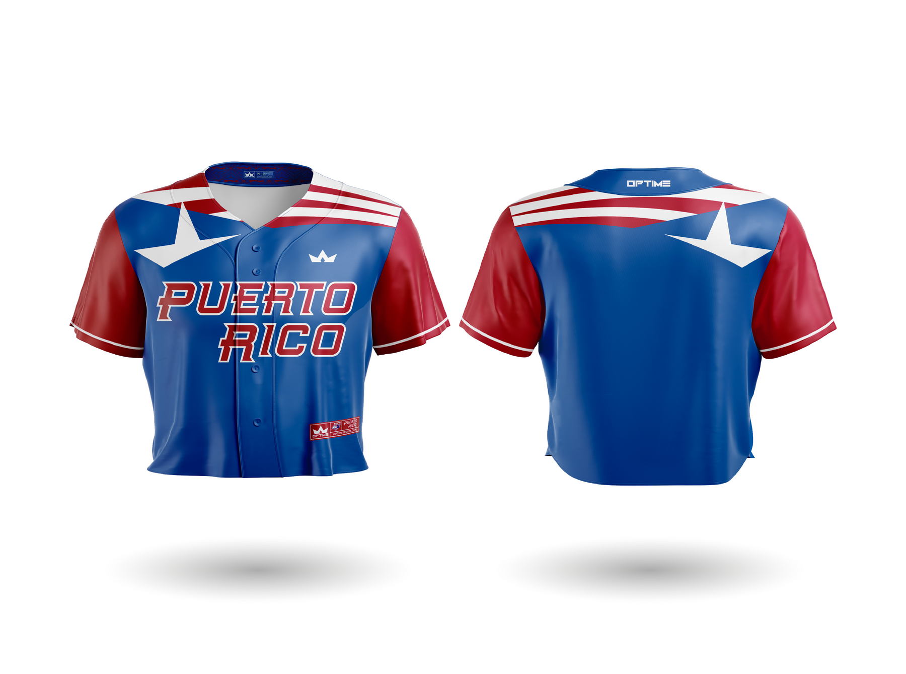 The PUERTO RICO BASEBALL CROP JERSEY is part of an exclusive patriotic collection celebrating the pride, passion, and identity of Puerto Rico on and off the field. Designed by OPTIME SPORTS, this cropped button-up jersey blends classic baseball aesthetics with a bold modern silhouette, creating a statement piece that represents culture, strength, and performance.